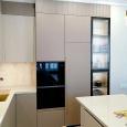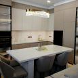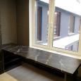 Столешница с интегрированной мойкой изготовлена из кварцевого камня.